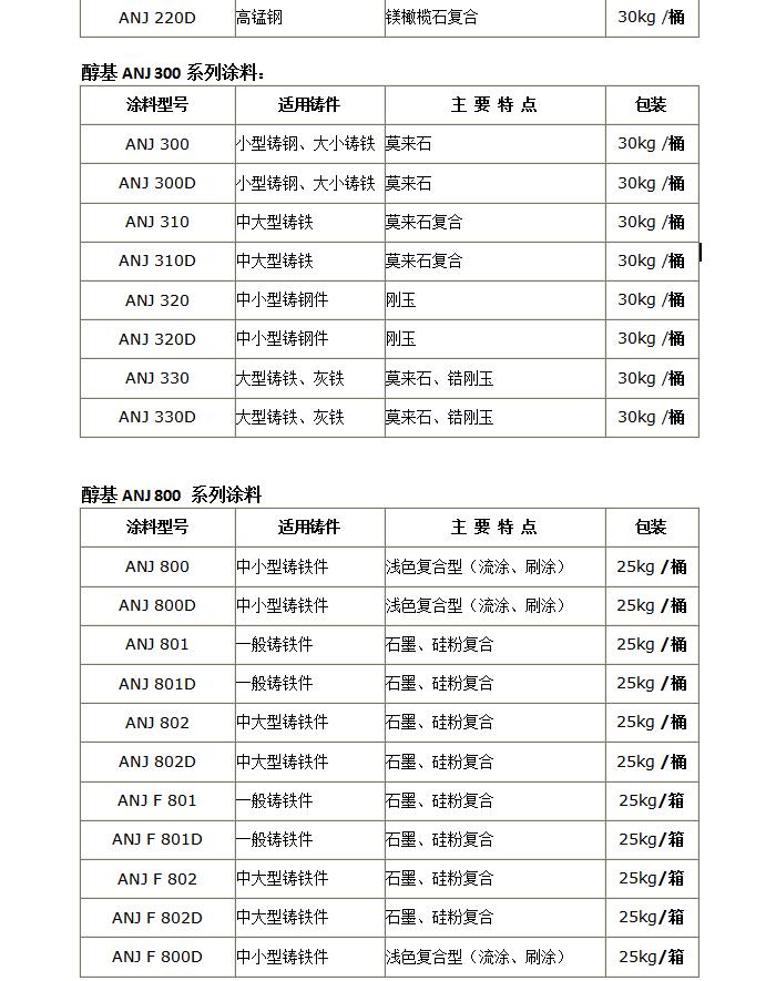 安耐捷公司ANJ醇基系列涂料,有著良好的流平性和觸變性,涂層無刷痕,懸浮性穩(wěn)定,發(fā)氣量小,易點(diǎn)燃,涂層強(qiáng)度高,不開裂,不起泡。耐火度高,鑄件表面光潔易清理。